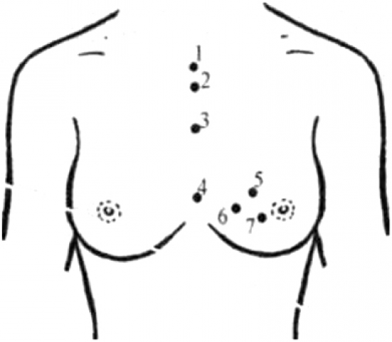• Зона над областю грудини. По середній лінії на рівні руків’я грудини біля місця її прикріплення до тіла, на рівні прикріплення III і V ребра (точки 1, 2, 3, 4).
