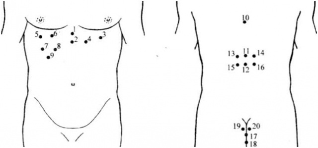 - Передньо-черевна зона - точки 1 і 2 по середній лінії (як правило, при патології вони злегка хворобливі); дуже ефективна приставка п’явок на точки 3 і 4 максимальна хворобливість в лівій половині передньо-черевної зони.