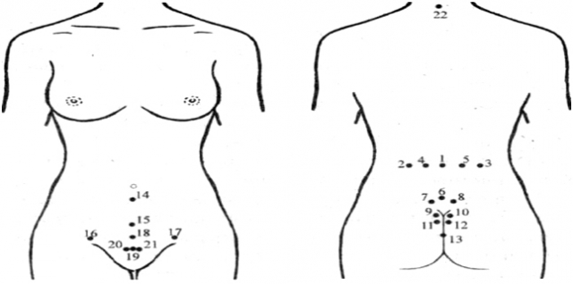 - Нижньочеревна зона - точки 14, 15, 18, 19 по середній лінії від пупка до лона; бажано знайти хворобливу точку, часто вона розташовується на межі нижньої і середньої третини лінії; точки 16 і 17 в пахових областях.