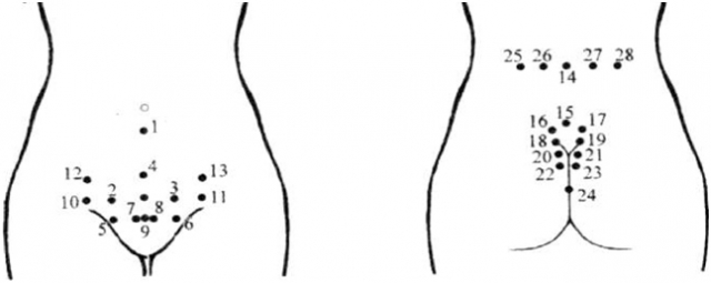 - Локальна зона - область над лобковою кісткою, точка 9 по середній лінії безпосередньо над лобковою кісткою і на 1 і 4 сантиметри ззовні (точки 5, 6, 7, 8).